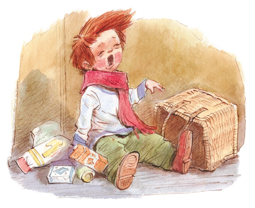 – Один не езди. Дождись взрослого и заходи в лифт вместе с ним, – сказала мама и стала перечислять, что нужно купить. Она назвала всё два раза, и Уле-Александр всё повторил. Он поставил корзинку на голову и помчался вниз по лестнице. Пока он бежал, сочинял песенку, чтобы запомнить все покупки.