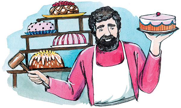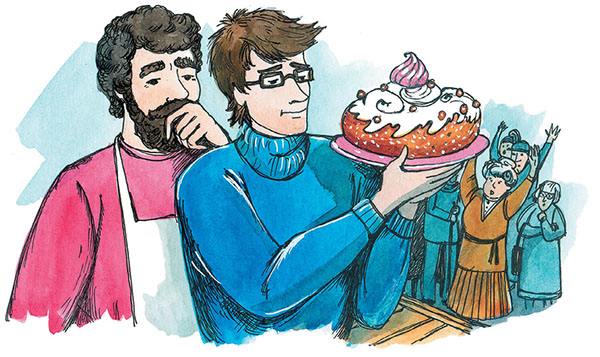 Словом, этот день ничуть не походил на обычный, но, когда на площадь Тириллтопена въехал грузовик духового оркестра, люди и вовсе оторопели и смотрели во все глаза. В кузове стояла самая настоящая пирамида, на каждой ступеньке которой лежало по торту, а рядом с пирамидой стоял бородатый здоровяк в широком белом переднике. Он размахивал молотком и громко кричал: