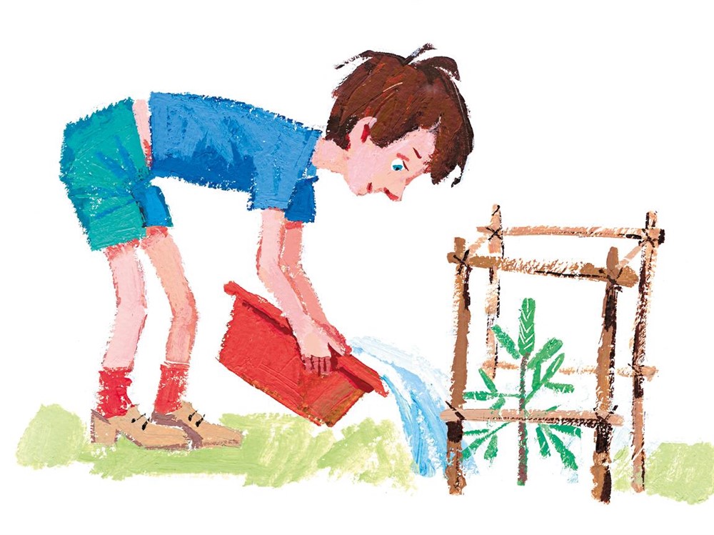 Мортен подбежал к бабушке, схватил таз с водой и понёс его к своей ёлочке, которая росла в ограде. Он бережно полил деревце сверху и под корнями. Гюро увидала, что и Милли тоже забрала лоханку с водой и понесла на огород.