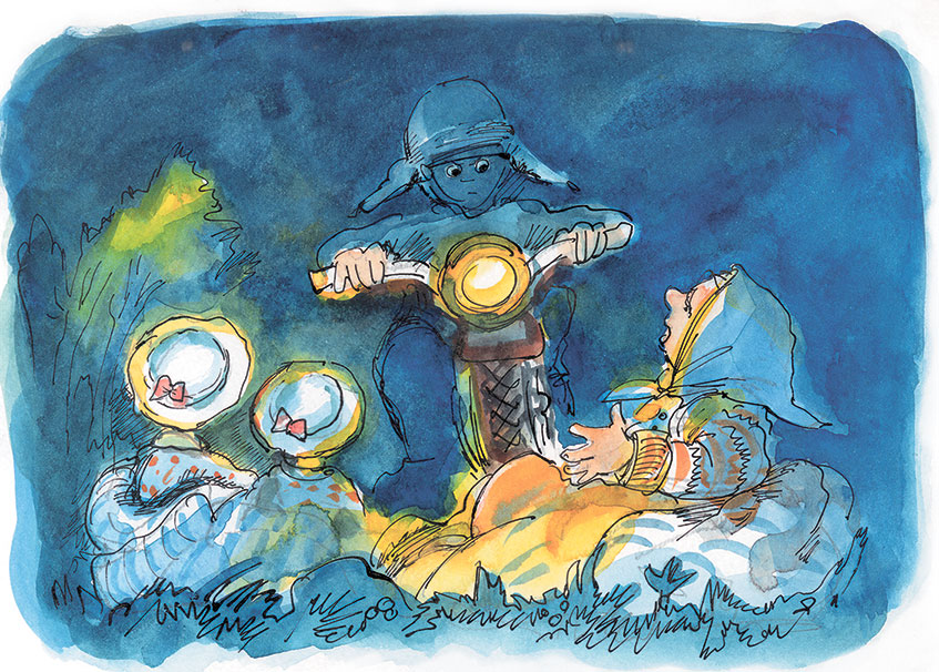 – Правильно. Надо ещё немного проехать, – сказал папа. – Разве я не обещал вам, что мы приедем на маленький пляж, где вы сможете играть? Сейчас сворачивайте направо и, пожалуйста, не смотрите вдаль. Обещайте смотреть только на два метра перед вашим носом, чтобы не наехать друг на друга.