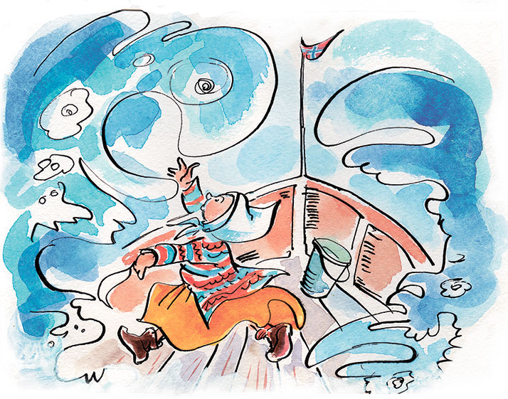 Папа спел эту колыбельную, потом повторил её ещё и ещё. Дети заснули, мама заснула, заснул и сам папа, убаюканный собственным пением. А вот бабушке всё ещё не спалось. Она сидела, пока у неё не заболела спина, но лечь так и не решилась. Ведь кто-то должен быть начеку. А вдруг все на борту заснули? И даже рулевой? Нет, только не в такую бурю! Бабушка вытащила ноги из спального мешка и встала. Это оказалось не так-то просто, потому что судно то падало в морскую пучину, то снова выныривало и всё время переваливалось с боку на бок. Но бабушка ухватилась за торчащий в переборке крюк, подтянулась и встала. Некоторое время она покачивалась, стараясь обрести равновесие. В конце концов кое-как ей это удалось. Однако как уследишь за порядком на судне, если сама едва держишься на ногах? И тут бабушка вспомнила, что все моряки ходят вразвалку, широко расставляя ноги, и что это называется матросской походкой. Бабушка широко расставила ноги и попробовала постоять, ни за что не держась. И ей это удалось! Прежде всего ей захотелось подойти к поручням и посмотреть на волны. При виде волн у неё перехватило дыхание, ей показалось, что море сейчас её поглотит. Она не на шутку испугалась, но, постояв у поручней ещё немного, она уже не могла оторвать глаз от моря.