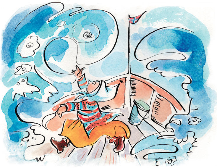 Папа спел эту колыбельную, потом повторил её ещё и ещё. Дети заснули, мама заснула, заснул и сам папа, убаюканный собственным пением. А вот бабушке всё ещё не спалось. Она сидела, пока у неё не заболела спина, но лечь так и не решилась. Ведь кто-то должен быть начеку. А вдруг все на борту заснули? И даже рулевой? Нет, только не в такую бурю! Бабушка вытащила ноги из спального мешка и встала. Это оказалось не так-то просто, потому что судно то падало в морскую пучину, то снова выныривало и всё время переваливалось с боку на бок. Но бабушка ухватилась за торчащий в переборке крюк, подтянулась и встала. Некоторое время она покачивалась, стараясь обрести равновесие. В конце концов кое-как ей это удалось. Однако как уследишь за порядком на судне, если сама едва держишься на ногах? И тут бабушка вспомнила, что все моряки ходят вразвалку, широко расставляя ноги, и что это называется матросской походкой. Бабушка широко расставила ноги и попробовала постоять, ни за что не держась. И ей это удалось! Прежде всего ей захотелось подойти к поручням и посмотреть на волны. При виде волн у неё перехватило дыхание, ей показалось, что море сейчас её поглотит. Она не на шутку испугалась, но, постояв у поручней ещё немного, она уже не могла оторвать глаз от моря.
