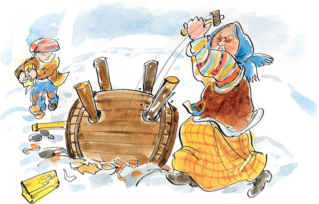Бабушка начала толкать и раскачивать бочку, а потом позвала на помощь и Мортена. Они вдвоём налегли на неё. Неожиданно бочка освободилась от ледяного плена и покатилась по земле. За ней покатились и бабушка с Мортеном.