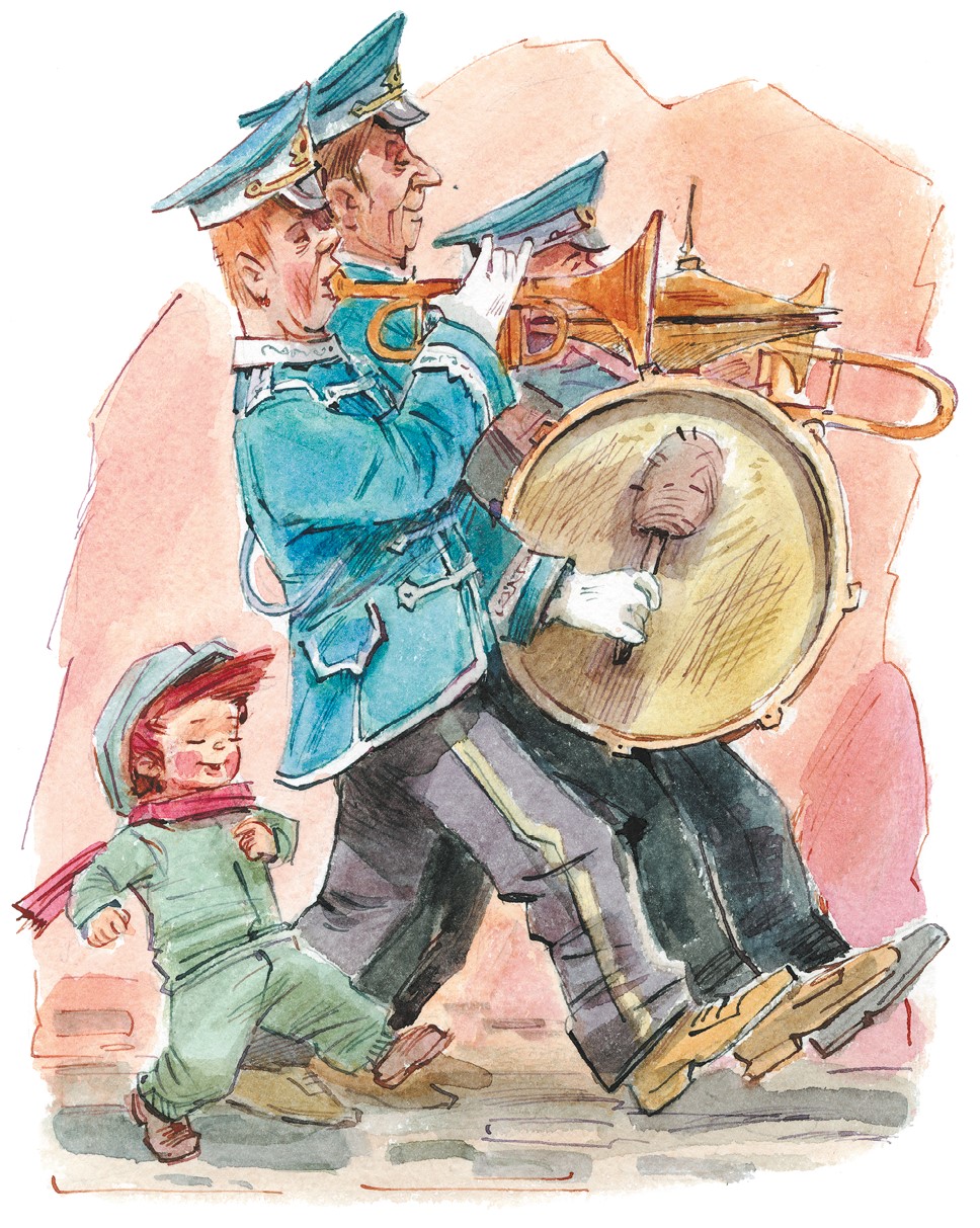 И он собрался уже переходить дорогу в обратную сторону, как вдалеке в конце улицы заслышал звуки. Не просто звуки, а самые прекрасные звуки на свете. Угадали? Нет? Это духовой оркестр шёл по улице с музыкой! Тилибом-бом-бом, играл оркестр. У музыкантов были красивые синие кители с серебряным шитьём и красивые фуражки с кокардами. Трубы и тромбоны сияли и переливались, музыканты надраили их до блеска.