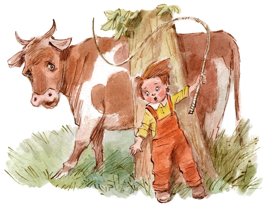 От страха он закричал что было мочи. И даже выскочил из-за дерева с кнутом наперевес и ещё раз громко крикнул прямо в морду корове. Корова ничего страшнее в жизни не видела и ужасно испугалась. Она развернулась на месте и галопом понеслась к дороге.