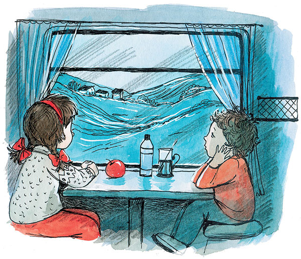Ничего подобного, поезд мчался по горным равнинам, а высокие вершины пролетали мимо них справа и слева. Время от времени они пропадали: их заслоняли изгороди, защищавшие путь от заносов. Так что даже в метель, когда ничего кроме летящего снега не видно, колёса сами находили железные рельсы. Но сегодня стояла прекрасная погода и снег сверкал на солнце. Семья Теге уютно расположилась у окна в вагоне-ресторане и с аппетитом обедала, любуясь горными видами.