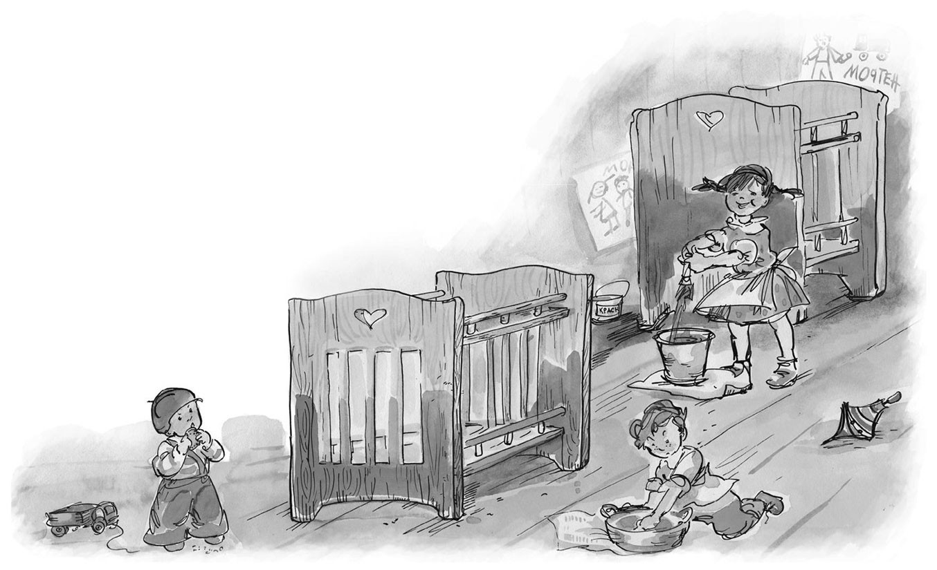 Мортен быстро засунул хлеб в рот и схватил кисть. Он глубоко обмакнул её в ведёрко с краской. Ого! – здесь ещё много краски! Мортен огляделся: что же ему покрасить? Кровати все уже выкрашены, красить их заново неинтересно. А вот пол… на него даже жалко было смотреть. Бедненький, он был просто коричневый, и во многих местах краска давно стёрлась. Мортен провёл кистью по полу. На полу осталась красивая красная полоска.