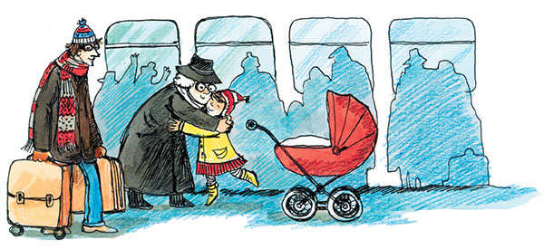 – Бабушкин поезд прибыл. Стой тут с коляской и никуда не уходи, а я побегу встречать бабушку.