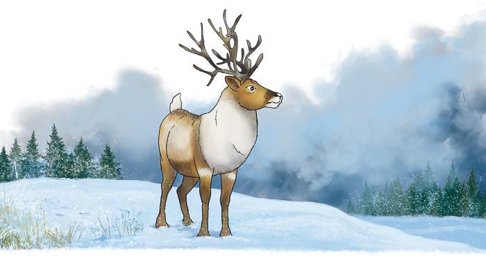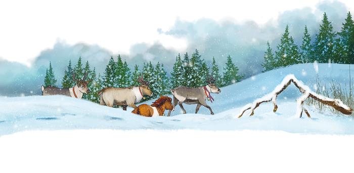 Стадо оленей укрылось от бури за хвойными деревьями. Прижавшись друг к другу, они пережидали непогоду на краю снежной полянки. Колокольчик вместе с братом и сестрой с теплотой вспоминали прошлый Новый год.