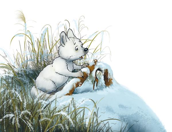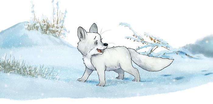 Бьерн маленький полярный лисёнок, сидел за большим корнем дерева и с интересом наблюдал за тем, что происходит. Ему было холодно, он дрожал и всё время смотрел на небо, где уже собирались непроглядные снежные тучи.