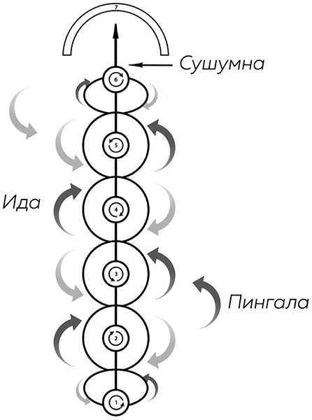 Две нади образуют фигуру, похожую на восьмерку вокруг чакр. Они называются Ида, что в переводе означает «луна», и Пингала – «солнце». Они переносят женскую и мужскую энергии соответственно и переплетаются, как спираль ДНК, вокруг Сушумны. Исходя из утверждения, что они двигаются в противоположных направлениях, одна – вверх, другая – вниз, можно представить, как они активируют движение чакр. Последние, как шестерни, чередуют свое вращение то по часовой стрелке, то против. Как уже было замечено ранее, когда чакры вращаются, они дают нам энергию, чтобы мы могли идти по жизненному пути (см. рис. 2 и 3).
