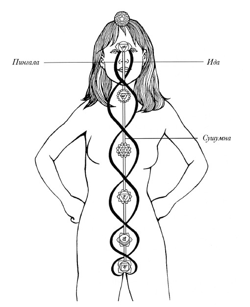 (Примечание автора: Некоторые тексты говорят, Ида и Питала пересекаются между чакрами, а некоторые – что они пересекаются в чакрах. Некоторые утверждают, что потоки начинаются (или кончаются) в правой и левой ноздрях)