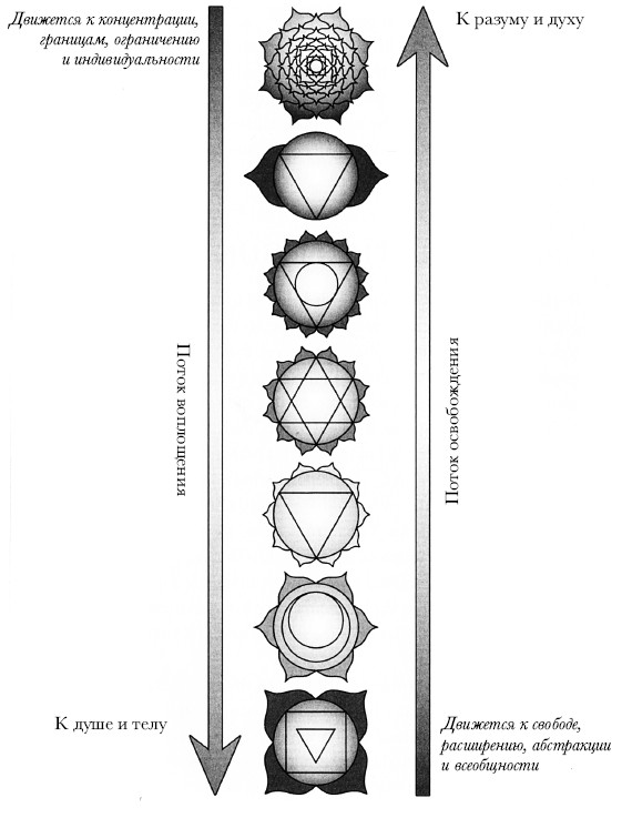 Можно представить чакры как камеры в теле, где эти две силы смешиваются в разных пропорциях. В каждой чакре разное соотношение потоков освобождения и воплощения. Чем ниже мы продвигаемся по системе чакр, тем сильнее проявляется поток воплощения. Чем выше – тем больше на чакры влияет поток освобождения. Это базовое противопоставление – необходимая основа для понимания того, как система работает в целом.