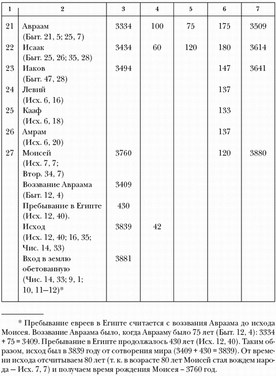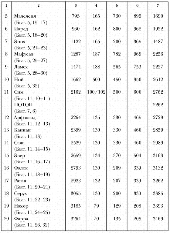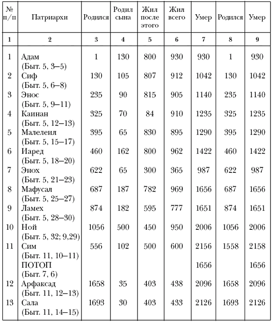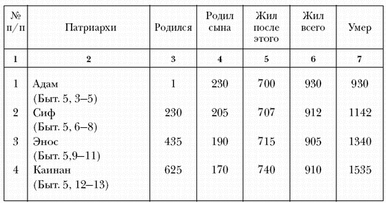 В главе 5-й первой книги Библии Бытие отражается история человечества в ее хронологическом порядке, по чину жизни допотопных патриархов, начиная от Адама и заканчивая Симом. Если проследить этот чин по тексту двух Библий, то вырисовывается следующая картина (см. табл. 1).