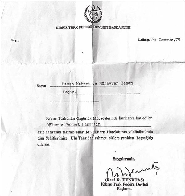 Resim: Kıbrıs Türk Federe Devleti Başkanı Rauf R. Denktaş’ın, Mehmet Hasan’ın Öldürüldüğünü Gösteren Yazısı (Münevver Seyhani’nin Arşivinden).