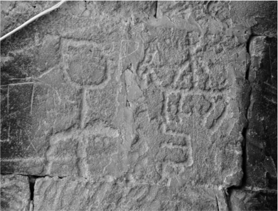 Foto 4: Karaçi Kervansarayı’nın (Azerbaycan) duvarlarından birinin üzerindeki “Gobu” damganın, “Kıpçak” damganın vd. görüntüsü (Alyılmaz, 2016: 617).