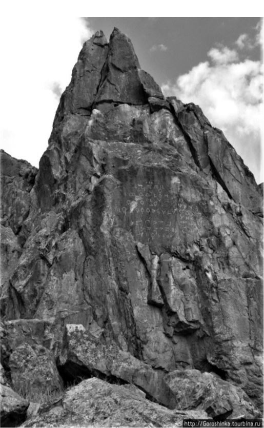 Foto 6: Üzerinde “Gobu” damga, “Kıpçak” damga vd. Türk damgalarını barındıran kaya kütlesinin görüntüsü (Tamgalı Taş; Kazakistan; Alyılmaz, 2016: 603).