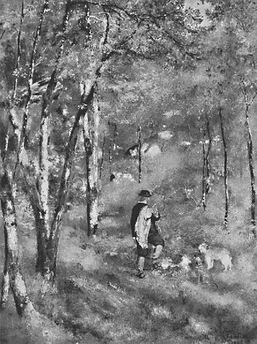 Вернувшись в Марлотт, Огюст стал применять технику Курбе, растирая краску ножом на полотне, когда писал натюрморты с цветами или пейзажные сценки, как, например, ту, где изображен Жюль Лe Kep с собаками в лесу[18].