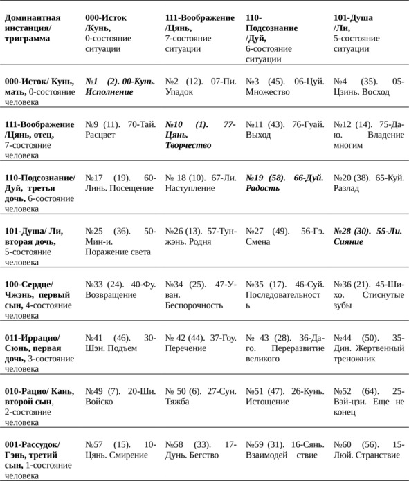 Для пользования Таблицей сначала сопоставьте наблюдаемые свойства состояний человека и ситуации с кратким описанием свойств инстанций психики (триграмм Фу Си) и определите, какое сочетание состояний человека и ситуации проявляется во взаимодействии человек—ситуация.