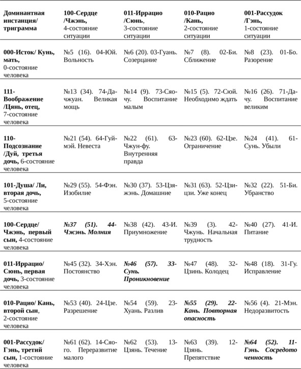 Для описания 64 сочетаний человек—ситуация (64 гексаграмм) применим обозначение из двух цифр. Левая цифра – номер доминантной инстанции человека, правая цифра – ситуации. Доминантные инстанции 1-Рассудок, 2-Рацио, 3-Иррацио, 4-Сердце, 5-Душа, 6-Подсознание, 7-Воображение, 0-Исток обозначим цифрами 1, 2, 3, 4, 5, 6, 7, 0. Тогда обозначение, например, 34-сочетание, показывает сочетание доминантной инстанции (триграммы) 3-Иррацио/Сюнь человека и доминантной инстанции (триграммы) 4-Сердце/Чжэнь ситуации.