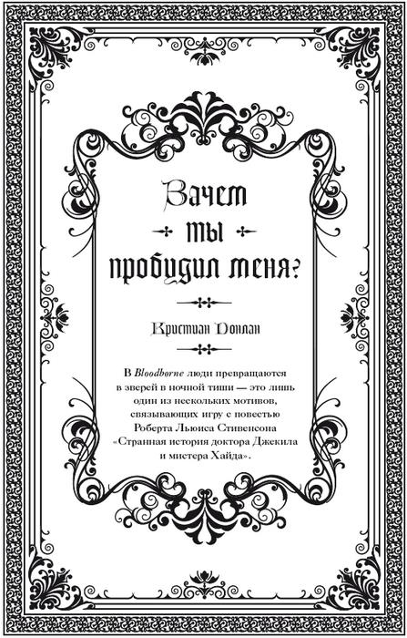 Если Стивенсон прошел со мной через всю жизнь, наверное, нет ничего удивительного, что и в странных играх он не отступает от меня ни на шаг. Но я считаю, что эта тема все-таки стоит внимания, потому что произведения Стивенсона – в частности, его повесть «Странная история доктора Джекила и мистера Хайда» – как бы показывают Bloodborne в интересном свете. На передний план вдруг выходят странные детали. Возникают новые гармонии. В конечном счете у меня такое ощущение, словно я узнал нечто, чего не узнал бы в другом случае.