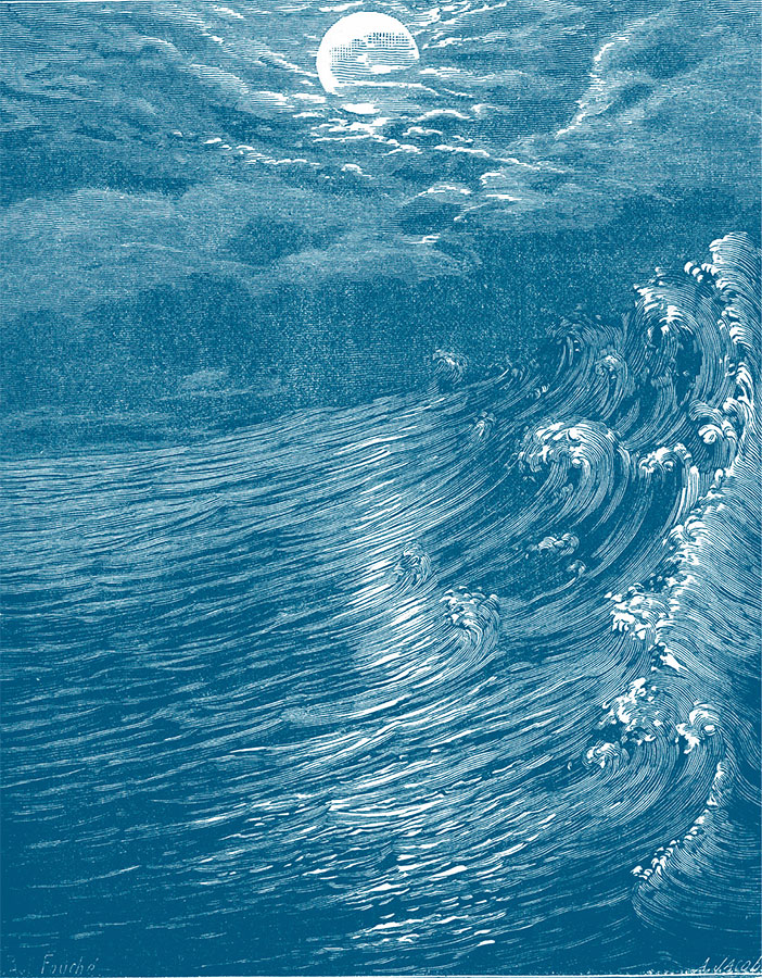 Над долиной Лера – гром;море выгнулось бугром;это буря в бреги бьет,лютым голосом ревет,потрясая копием!От Восхода ветер пал,волны смял и растрепал;мчит он, буйный, на Закат,где валы во тьме кипят,где огней дневных привал.От Полунощи второйпал на море ветер злой;с гиком гонит он валывдаль, где кличут журавлинад полуденной волной.От Заката ветер пал,прямо в уши грянул шквал;мчит он, шумный, на Восход,где из бездны вод растетДрево солнца, светоч ал.От Полудня ветер пал;остров Скит в волнах пропал;пена белая летитдо вершины Калад-Нит,в плащ одев уступы скал.Волны клубом, смерч столбом;дивен наш плывущий дом;дивно страшен океан:рвет кормило, дик и рьян,кружит в омуте своем.Скорбный сон, зловещий зрак!Торжествует лютый враг;кони Мананнана ржут,ржут и гривами трясут;в человеках – бледный страх.Сыне Божий, Спас мой свят,изведи из смертных врат;укроти, Владыка Сил,этой бури злобный пыл,из пучин восставший Ад!Думы изгнанника