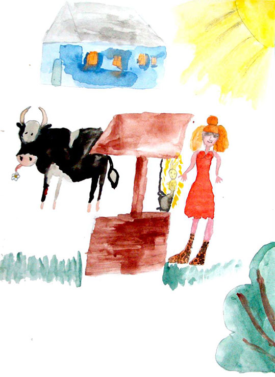 Как только ведро наполнилось водой, солнечный зайчик, не раздумывая, прыгнул на ободок ведра, и оно тут же пошло вверх. Скоро солнечный зайчик оказался на краю колодца.