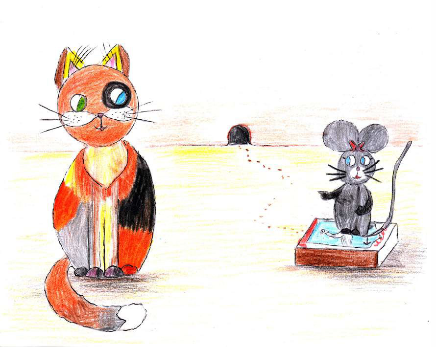 А сама думает, как бы быстрей выбраться на свободу. Мышка как услышала, что крокодил просит постоять на месте, еще больше испугалась и думает: «Это он специально попросил меня не уходить, чтобы прийти и съесть меня». И начала быстрее дырочку грызть для спасения.