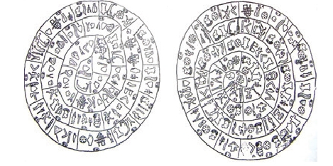 Терракотовый диск диаметром 16 см найден при раскопках города Фест на острове Крит в 1908 г.