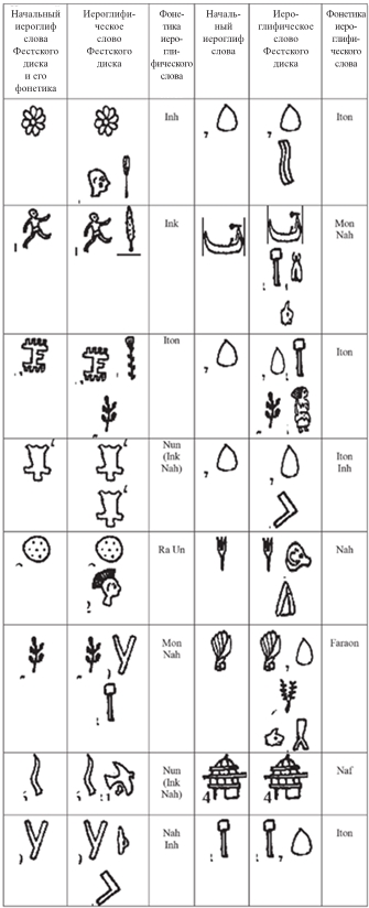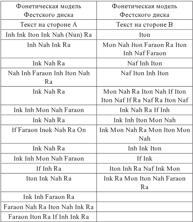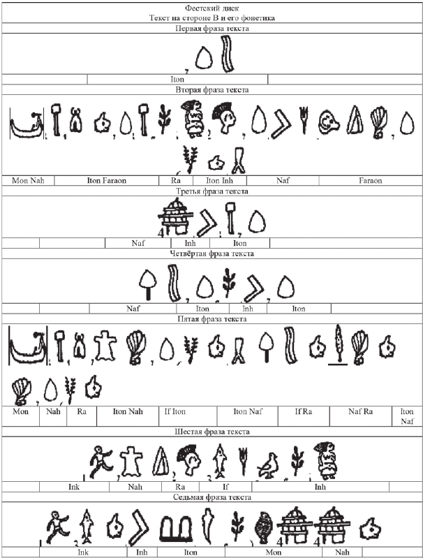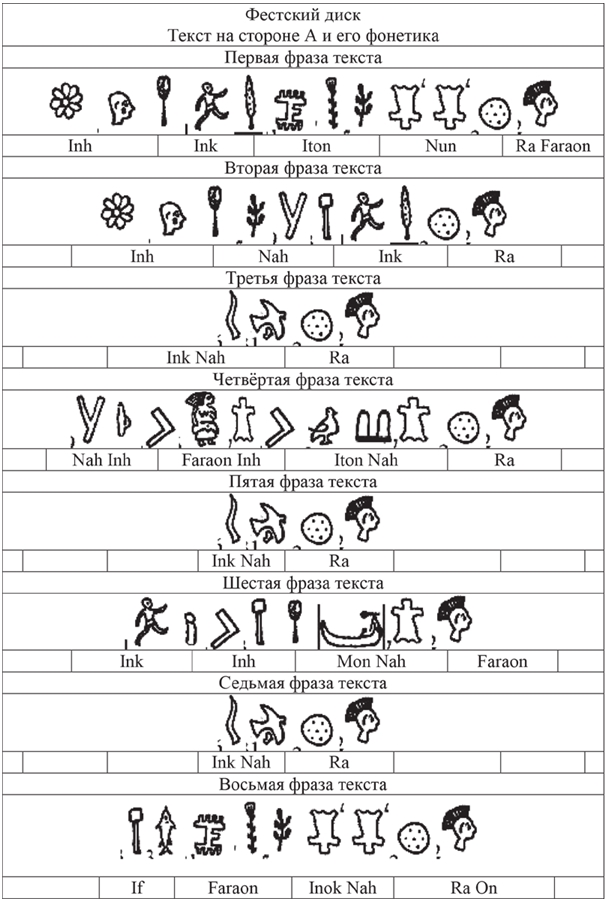 Тогда фонетика древнеегипетских «Гимнов Атона» может считаться фонетикой текстов Фестского диска, а перевод фонетики древнеегипетских «Гимнов Атона» будет считаться переводом фонетики лексики текстов Фестского диска.