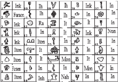 Применяя этот метод, попробуем подставить фонетику (или фонетическую матрицу) древнеегипетских «Гимнов Атона» в тексты Фестского диска. Если мы получим их полное слияние – фонетики египетских «Гимнов Атона» и лексики Фестского диска, тогда можно будет считать, что тексты Фестского диска представляют собой копии древнеегипетского храмового текста «Гимны Атона» (в «Гимнах Атона» – два текста, так же как и на Фестском диске), только выполненными другими видами иероглифики, что позволит считать идентификацию Фестского диска успешно проведённой.