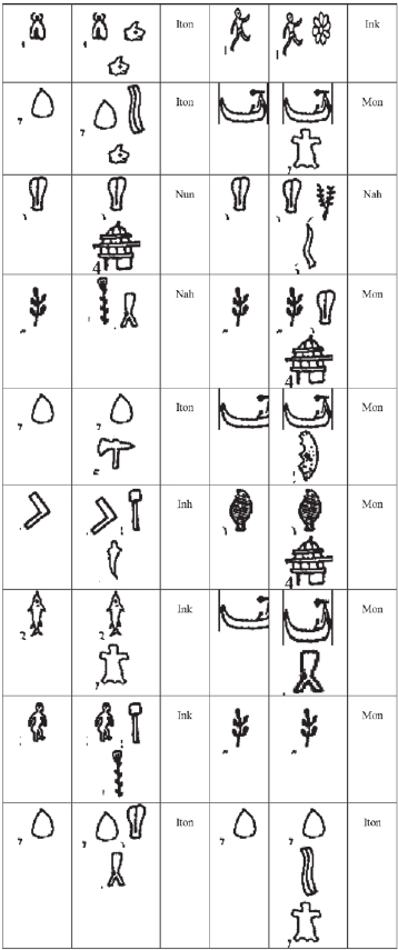 Одни и те же слова двух текстов Фестского диска могут состоять из одного, двух, трёх и более иероглифов, примером этого может служить слово Iton.