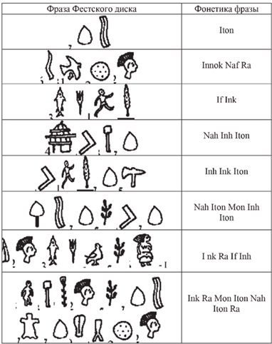 Исходя из этой исторической канонической структуры текстов Фестского диска и будем проводить нашу фонетическую идентификацию.