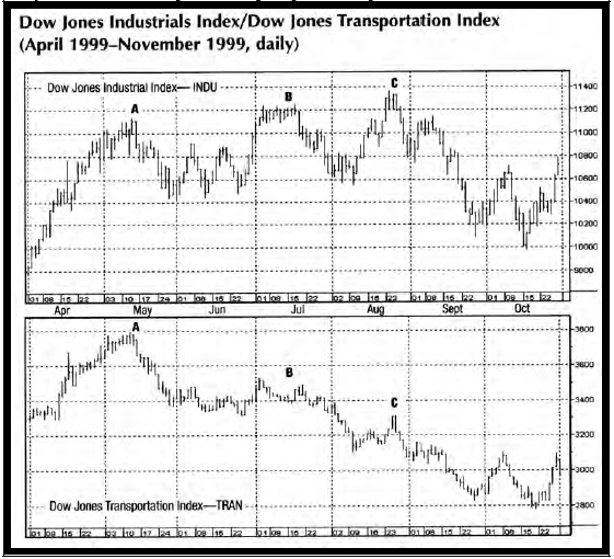 Доу также дал нам концепцию "подтверждения и неподтверждения", которая и сегодня является одним из наиболее широко используемых принципов технического анализа. Он утверждал, что изменения в основном тренде должны быть подтверждены двумя индексами – Dow Industrials и Transportation Averages. Сегодня, этот принцип подтверждения/неподтверждения, (также известный как дивергенция), используется для сравнения одного рынка с другим рынком или индексом на краткосрочной или долгосрочной основе. Этот принцип также может быть использован для сравнения движения цены с множеством технических индикаторов. "Неподтверждение" – это один из инструментов используемых для предупреждения о "неудачном тесте" или о потенциальном изменении направления колебания. Например, на Рис. 1 показано, что индекс Dow Industrials делает новые максимумы в точках В и С, которые не подтверждены индексом Transports. Далее следует снижающийся тренд. Это пример неподтверждения.