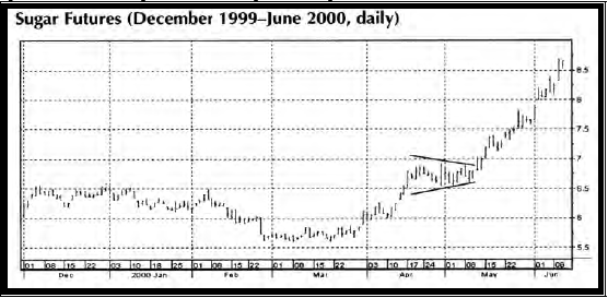Модели продолжения включают в себя треугольники, малые прямоугольники, вымпелы и флаги. Обычно они формируются в силу того, что предыдущее движение было слишком быстрым. Агрессивные свинг-трейдеры понимают, что модели продолжения являются одним из лучших методов выявления предпосылок к сделкам с наиболее предпочтительным отношением риск/доходность. Чем больше времени трейдер проводит в рынке, тем большему рыночному риску он себя подвергает. Задачей торговли на краткосрочных рыночных свингах является попытка вырвать большую часть прибыли за меньшее время. Для примера, на Рис. 2 приведена модель продолжения в виде так называемого "бычьего флага". Предшествующее движение наверх было таким сильным, что оно сформировало "древко" флага.
