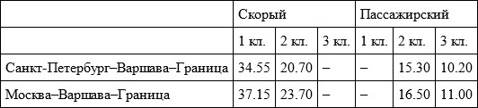 Прибыв в Варшаву, поезд оставался там на долгую трехчасовую стоянку, после чего в 15.52 отправлялся в направлении пограничного городка с тавтологическим названием Граница (Бендинского уезда Петроковской губернии; ныне Sosnowiec Maczki), куда прибывал в 21.42 и где заканчивалась колея российского стандарта: здесь пассажирам предстояла пересадка на поезд австрийских железных дорог. Впрочем, этот путь был не единственным возможным: зачастую пересадку делали в Варшаве, заодно совершив краткую экскурсию по городу. Таким образом, общее время пути от Петербурга до Варшавы составляло 17 часов 25 минут, а до российско-австрийской границы (с учетом трехчасовой стоянки) – чуть менее 27 часов.