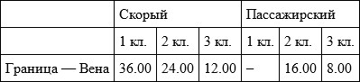 Билет от Варшавы до Вены на поезд общества стоил 38,75 рубля в первом классе и 25,51 во втором. Билеты от Границы до Вены на австрийский поезд стоили (в австрийских же кронах[151]):