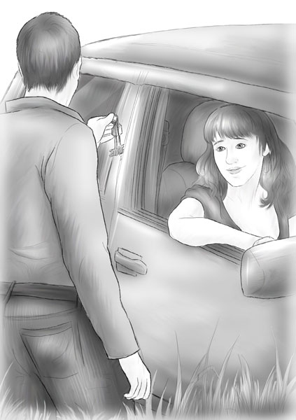 Пробравшись в кромешной темноте к моей дверце машины и опустив руку в заросшую по пояс траву, он достал маленькую связку потерянных ключей.