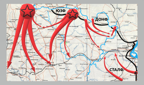 Составители карты показали, в частности, сосредоточение стратегических резервов, создание юго-восточнее Воронежа нового фронта в составе трех общевойсковых армий и двух мощных конно-механизированных групп. Согласно замыслу, новому фронту предстояло наступать с плацдарма на правом берегу Дона в районе Серафимовича и вырваться к Тацинской, что позволило бы перехватить железнодорожные и другие пути противника из-под Сталинграда на запад. Затем фронт должен был наступать через Каменск в район Ростова, где и пересекались бы пути отхода немецко-фашистских войск не только из-под Сталинграда, но и с Кавказа[42]