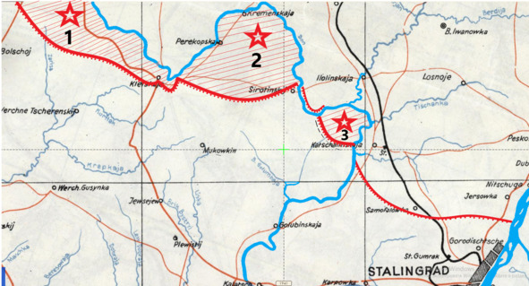 Однако при более внимательном осмотре соседних территорий, вы легко обнаружите еще один плацдарм! Действительно, взглянув на карту боев в малой излучине Дона, мы увидим, что в середине ноября советских плацдармов было не два, а три!