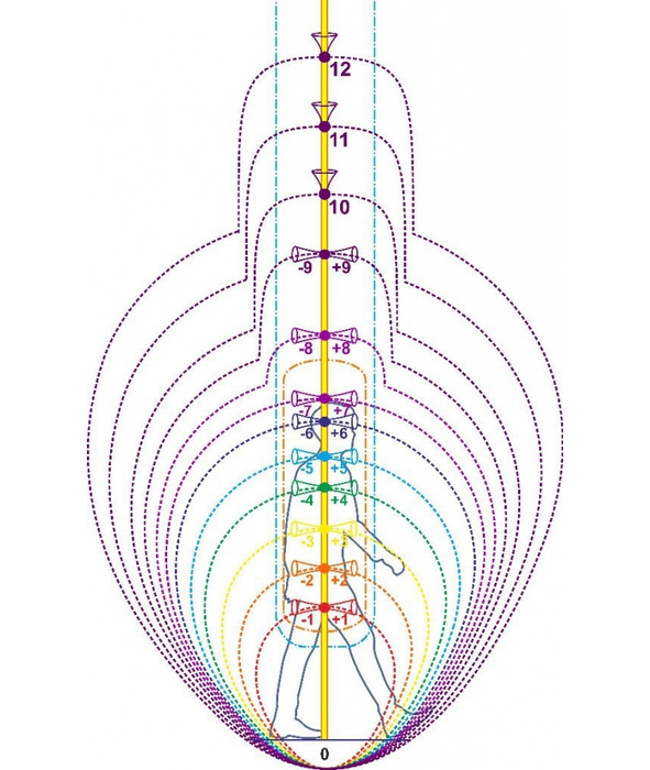 Вокруг позвоночника располагаются энергетические центры – чакры, разделённые на «+» (передняя часть) и «-» (задняя часть). Они обеспечивают циркуляцию жизненной энергии и связаны с разными мерностями и планами бытия. Заблокированные чакры приводят к болезням и энергетическим нарушениям.