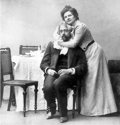 Сцена из спектакля «Чайка» в Московском Художественном театре. В роли Аркадиной – Ольга Книппер, в роли Тригорина – Константин Станиславский. 1899 год[14]