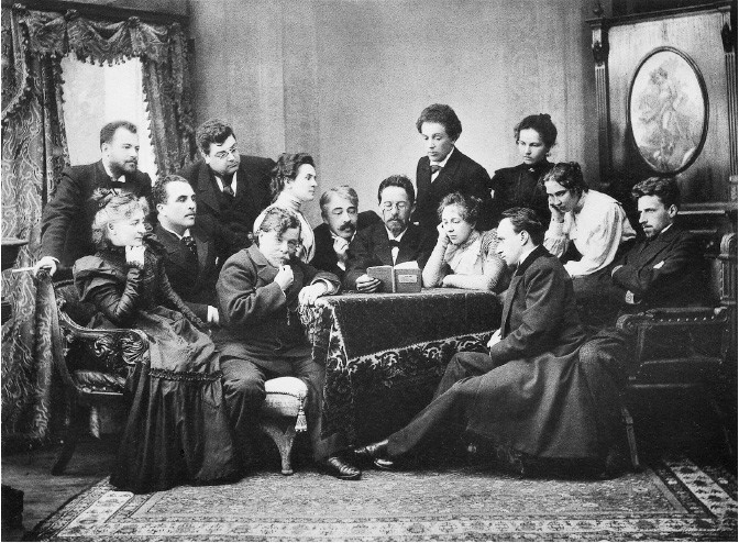 Антон Чехов (в центре) с актерами Московского Художественного театра за чтением пьесы «Чайка». 1899 год[15]