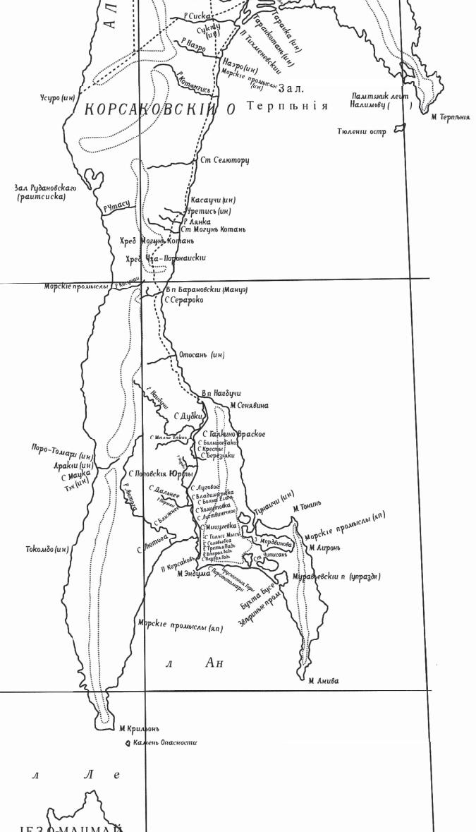 Чтобы покончить с вопросом о перешейке и полуострове, считаю не лишним сообщить еще некоторые подробности. В 1710 г. пекинскими миссионерами, по поручению китайского императора, была начертана карта Татарии; при составлении ее миссионеры пользовались японскими картами, и это очевидно, так как в то время о проходимости Лаперузова и Татарского проливов могло быть известно только японцам. Она была прислана во Францию и стала известною, потому что вошла в атлас географа д’Анвилля. Эта карта послужила поводом к небольшому недоразумению, которому Сахалин обязан своим названием. У западного берега Сахалина, как раз против устья Амура, на карте есть надпись, сделанная миссионерами: «Saghalien-angahata», что по-монгольски значит «скалы черной реки». Это название относилось, вероятно, к какому-либо утесу или мысу у устья Амура, во Франции же поняли иначе и отнесли к самому острову. Отсюда и название Сахалин, удержанное Крузенштерном и для русских карт. У японцев Сахалин называли Карафто или Карафту, что значит китайский остров.