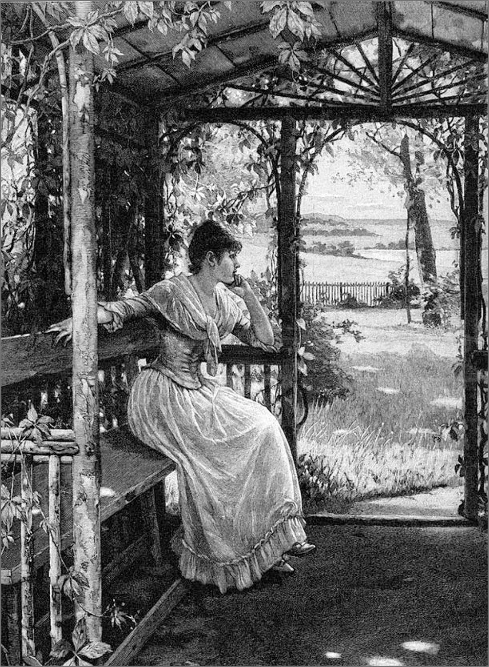 Леля сидела на скамье, куталась в шаль и задумчиво глядела сквозь деревья на речку.