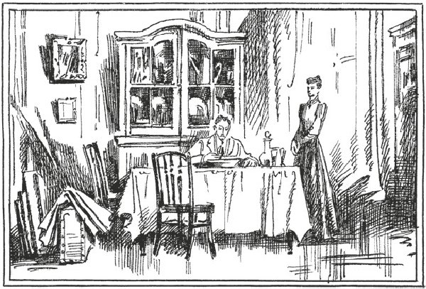 Столовая в доме Сорина. Направо и налево двери. Буфет. Шкап с лекарствами. Посреди комнаты стол. Чемодан и картонки; заметны приготовления к отъезду.