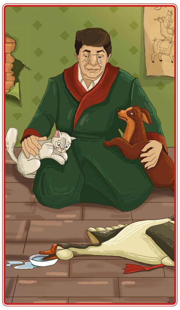 И по его щекам поползли вниз блестящие капельки, какие бывают на окнах во время дождя. Не понимая, в чём дело, Тётка и Фёдор Тимофеич жались к нему и с ужасом смотрели на гуся.