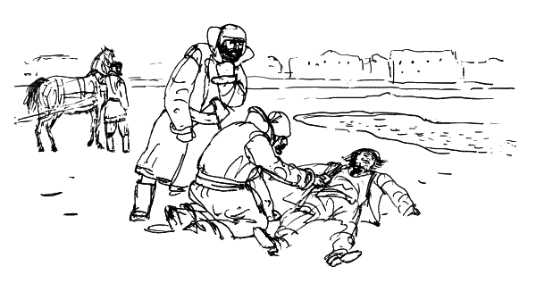Романов, как видно, от моего разноса совсем обалдел. Вместо того чтобы добежать до ближайшего спуска к Неве, перемахнул через парапет и сиганул в сугроб, что по набережным каждую зиму сваливают с тротуаров. Ну и провалился по пояс. Выкарабкался кое-как и побежал гусиными шажками, а шашка так и болтается. Вот умора!