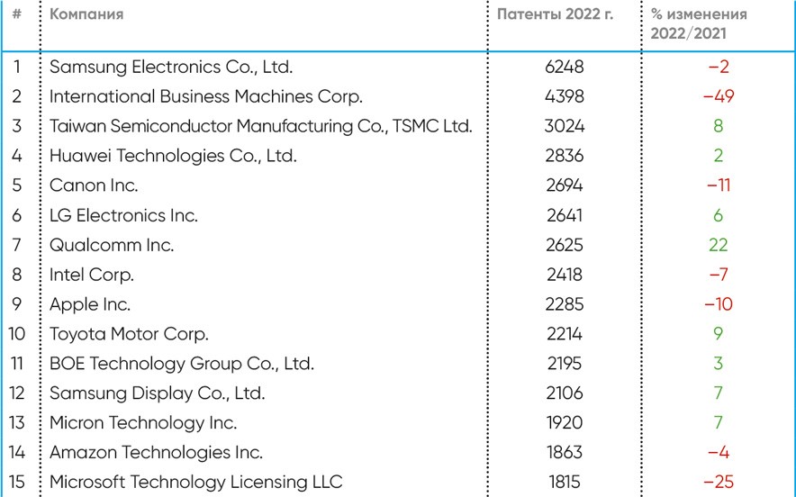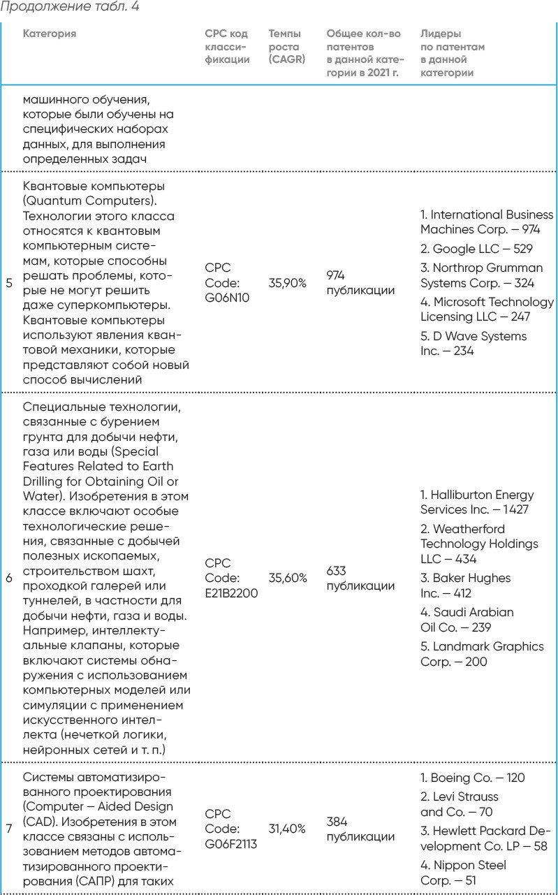 Анализ IFI Claims Patent Services и составленный на его основе «Рейтинг 10 самых быстрорастущих технологий на патенты, оформленные в США»[81], [82] – один из наиболее эффективных инструментов, позволяющих определить технологические направления развития крупнейших корпораций мира, погрузиться в изучение самых перспективных трендов и понять, кто и как планирует на них зарабатывать на самом конкурентном технологическом рынке мира, на котором разворачивается борьба за глобальное лидерство в сфере высоких технологий. Для удобства читателя информация представлена в динамике изменений за 2022 г. и для наглядности приведены данные за 2021 г. (табл. 4, 5).