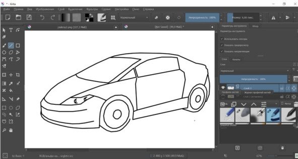 Основой проектной деятельности является программное обеспечение. Инструментами для проектирования служат программы, выполняющие различную функцию. Создание информационной модели автомобиля DUBINA EVO начиналось с эскизного проекта. Эскиз был создан в бесплатном растровом графическом редакторе Krita. Это программное обеспечение с открытым кодом, входящее в состав KDE. Krita разрабатывается преимущественно для художников и фотографов, распространяется на условиях GNU GPL. Программа поддерживает неразрушающее редактирование слоев и масок, работу в различных цветовых пространствах и с различными цветовыми моделями – RGB, CMYK, LAB, в режиме от 8 до 32 бит с плавающей точкой на канал. Кроме того, реализованы популярные фильтры (такие как нерезкое маскирование), корректирующие слои, маски и динамические фильтры, а также серия инструментов для ретуши. Однако основным приоритетом разработчики ставят реализацию возможностей для художников. В эскизном проекте представлялась концепция автомобиля, его габаритные размеры, конструктивные особенности. После определения основных размеров и конструктивных особенностей создавались чертежи будущего автомобиля.